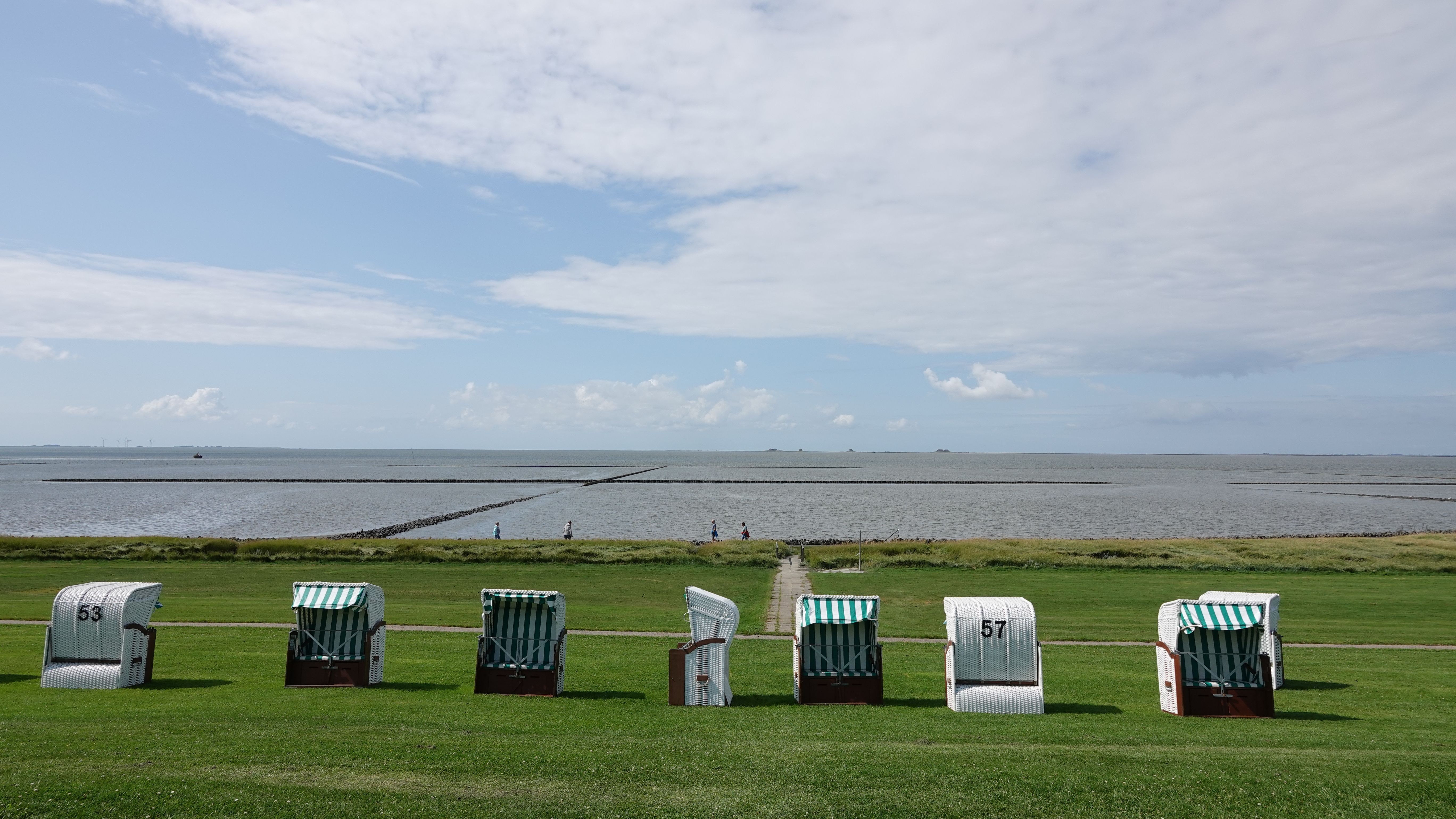 Entlang der Küste gibt es dafür ausgeschilderte Badestellen. Am Deich gelegen, findet jeder ein idyllisches Plätzchen im Gras mit einzigartigem Ausblick auf das Wattenmeer. Wer nicht im Gras liegen mag, macht es sich in einem Strandkorb bequem. Auch Vierbeiner können sich in den Bereichen für Hunde im kühlen Nass der Nordsee erfrischen.